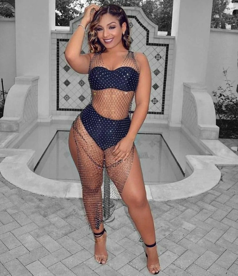 Robe longue en maille transparente avec strass et fente latérale