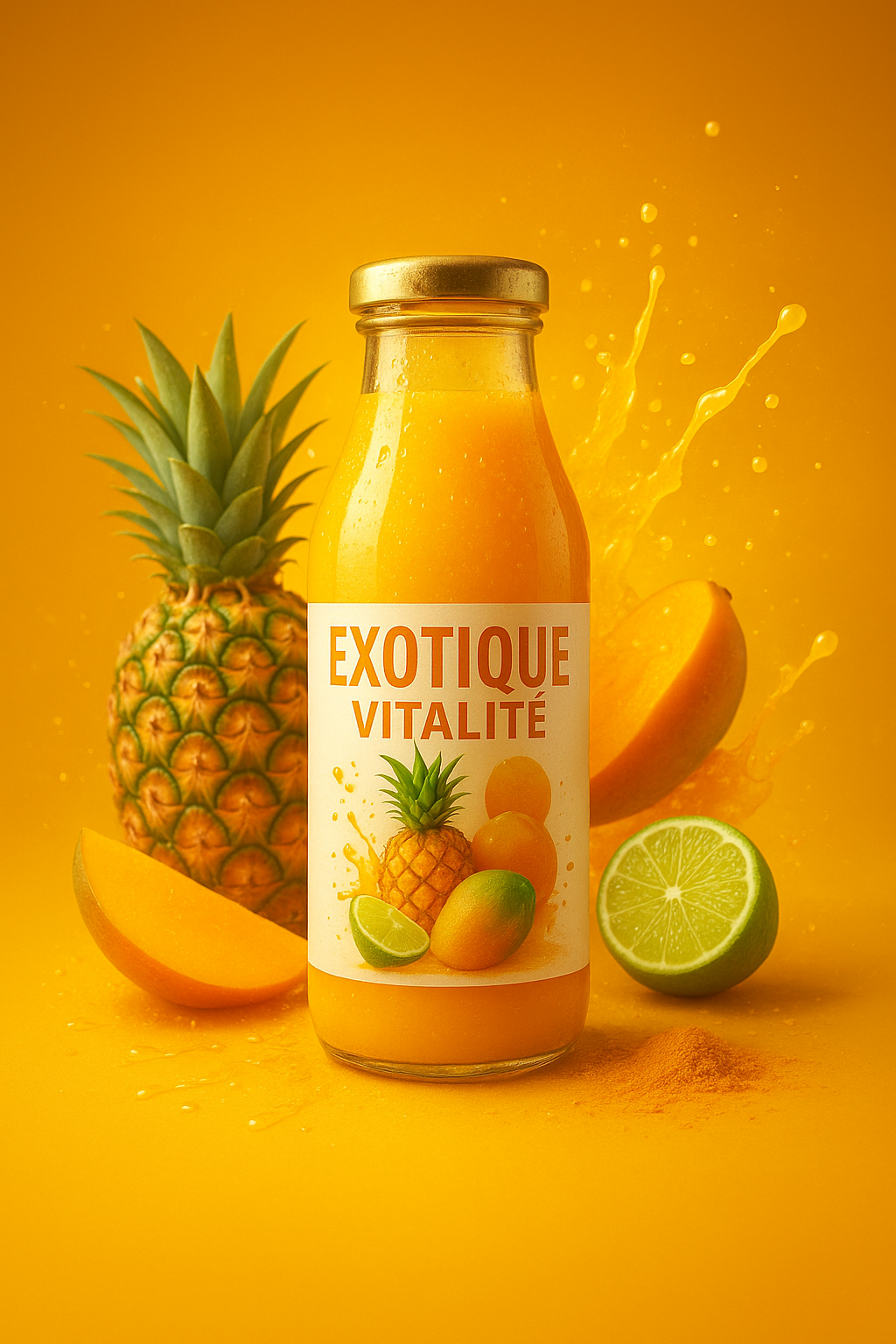Le Jus Exotique Vitalité est conçu pour revitaliser votre corps et booster votre énergie au quotidien. Avec ses saveurs fruitées et rafraîchissantes, il combine plaisir et bienfaits pour une expérience saine et gourmande.